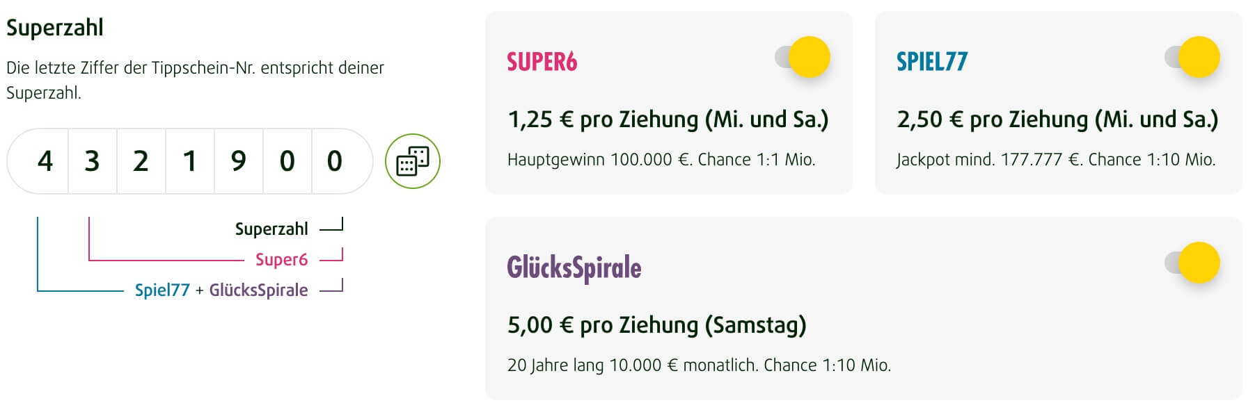 Super6 ist ein Zusatzspiel, bei dem ein Spiel 1,25 Euro pro Ziehung kostet. Deine Gewinnchancen hängen von der Anzahl der richtigen Endziffern und deiner Losnummer ab. Es gibt verschiedene Gewinnklassen, und der Höchstgewinn beträgt 100.000 Euro.